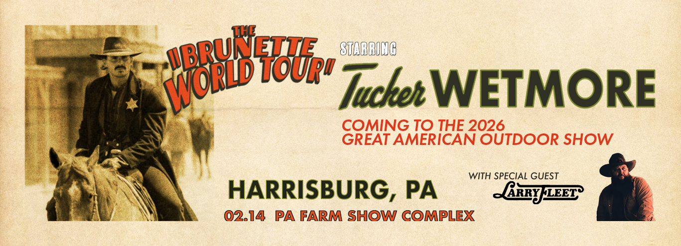 THE BRUNETTE WORLD TOUR starring TUCKER WETMORE and special guest Larry Fleet will be coming to the 2026 Great American Outdoor Show presented by NRA COUNTRY! Join fellow outdoor enthusiasts for an unforgettable night of music on Saturday, February 14th at the Pennsylvania Farm Show Complex in Harrisburg, PA!